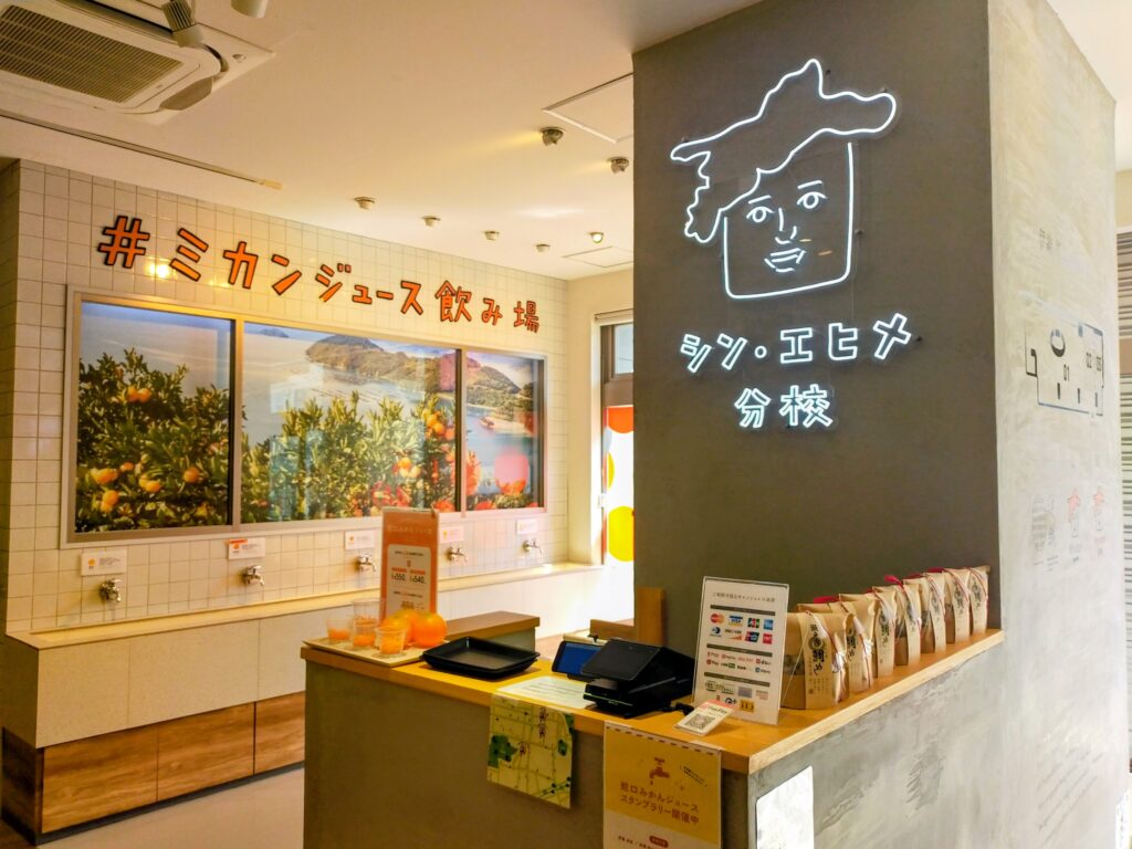 「シン・エヒメ分校」は、松山ロープウェイ街にある「伊織 お城下店」の中に併設されています。ここでは蛇口みかんジュース体験と柑橘ジュースの飲み比べができるようになっていて、5口の蛇口が並び、温州(うんしゅう)みかん・清見など季節ごとに変わる愛媛県産柑橘の中から好みの品種を選べます。110mlの小カップで3種気になる柑橘ジュースを選んで飲むことも出来ます。