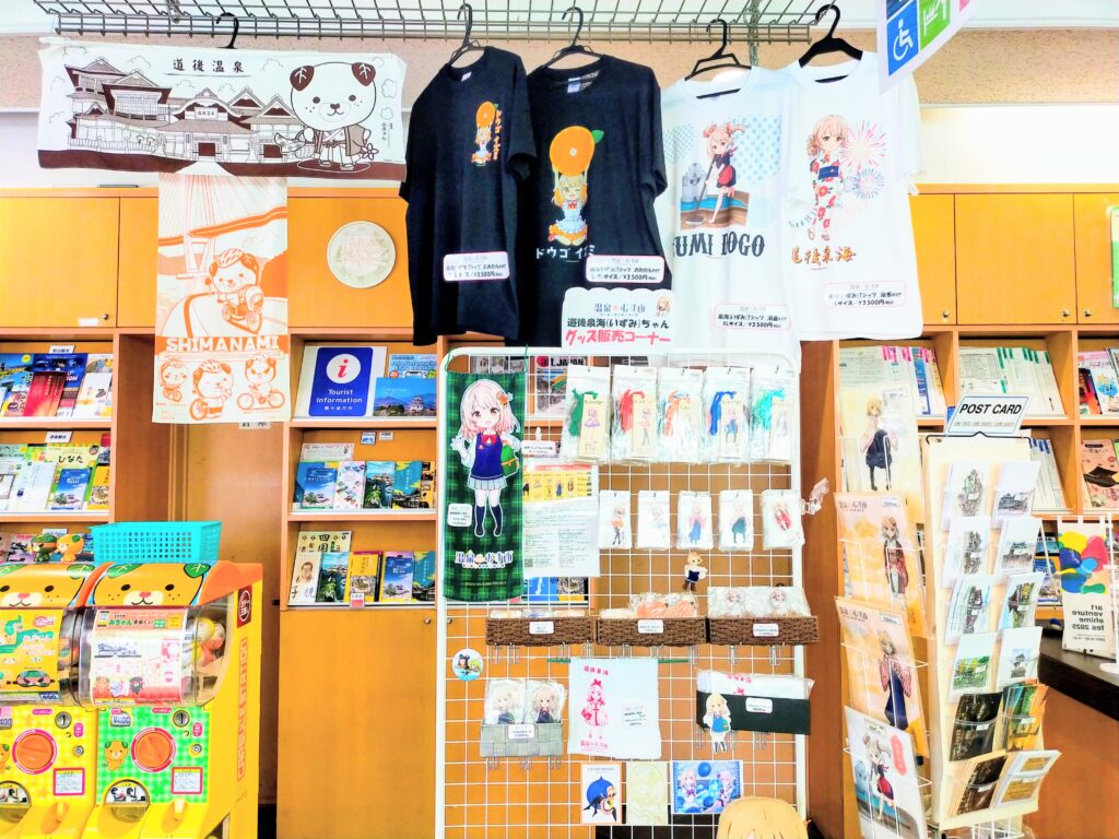 道後温泉のキャラクターTシャツやグッズ、愛媛のイメージキャラクター「みきゃん」のタオルなども販売されていました。