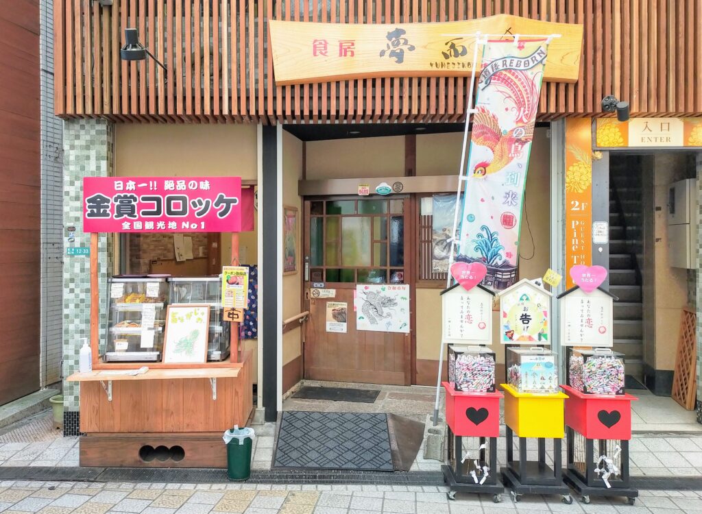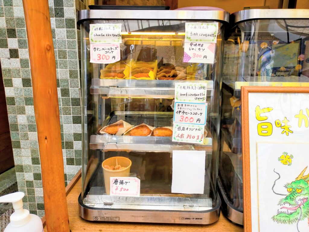 もともとは精肉店として創業し、現在は「食房 夢而今(むじこん)」という食堂を併設。店頭ではテイクアウト専門の揚げ物を販売しており、観光客や地元の人々で常ににぎわっています。