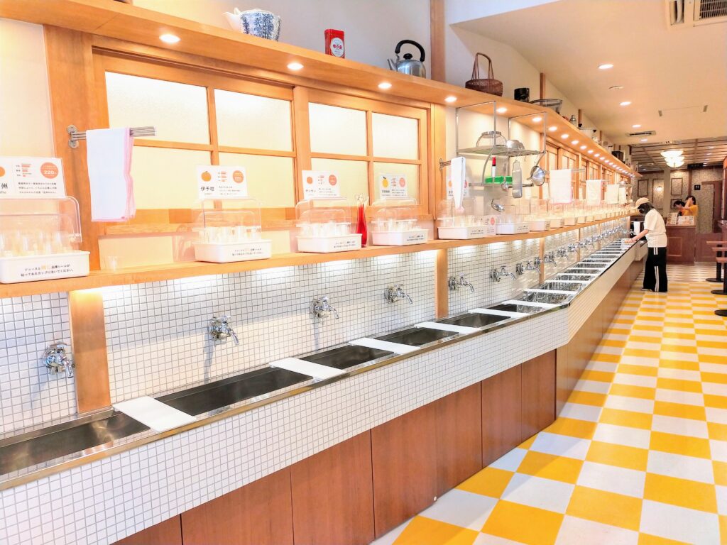 20本の蛇口が並ぶ圧巻のビジュアルでSNS映え抜群!飲み比べトレーに並ぶカラフルなジュースは品種ごとの色の違いが美しく映えます。レトロな店内と鮮やかなみかんジュースの組み合わせが“昭和×愛媛”の世界観を演出してくれますよ。