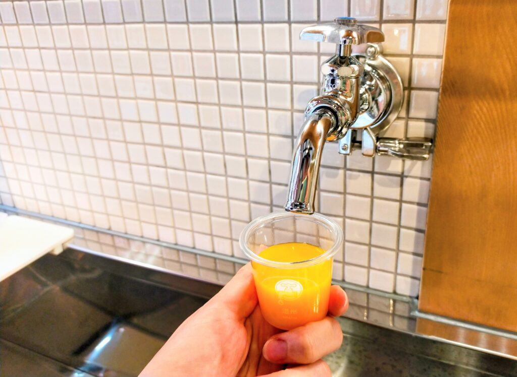 店内には、ずらりと並ぶ20本の蛇口。それぞれから異なる品種の100%ストレートみかんジュースが出てくるという、まさに“柑橘のテーマパーク”です。