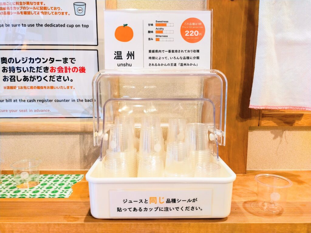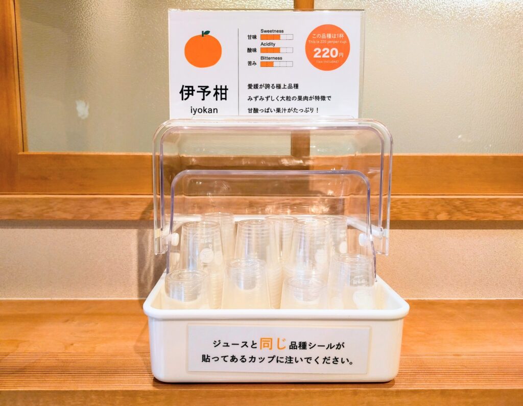 私は、3種類のトレーを選びました。20種類の蛇口からどのジュースを選ぼうかな〜?とワクワクしながら愛媛で王道の柑橘【温州・伊予柑・紅まどんな】をセレクしました!