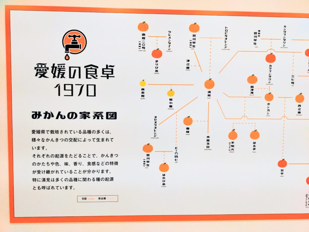 壁には「みかんの家系図」と題した柑橘の種類がずらり。たくさんありすぎて、正直、、、分かりません。ってなります。笑