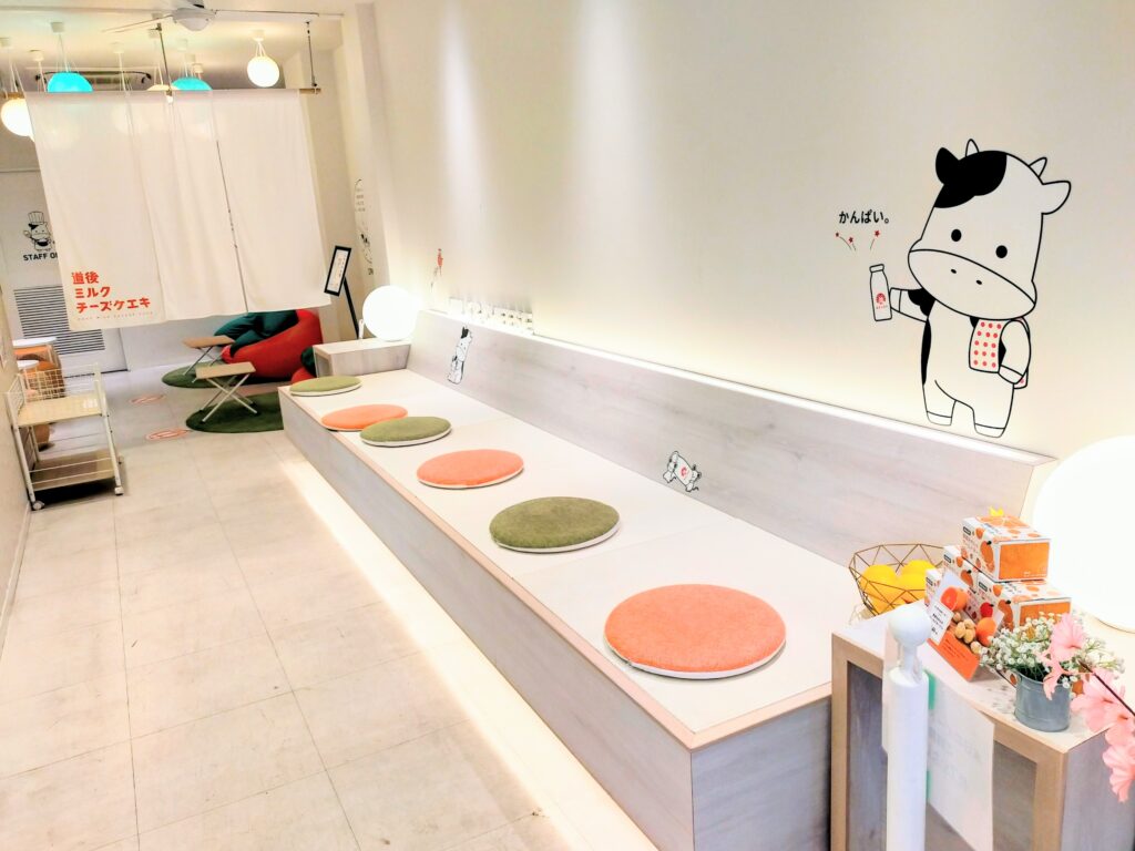 店内は白を基調としたナチュラルな空間で、牛乳瓶やチーズのオブジェが並ぶ可愛らしい内装。