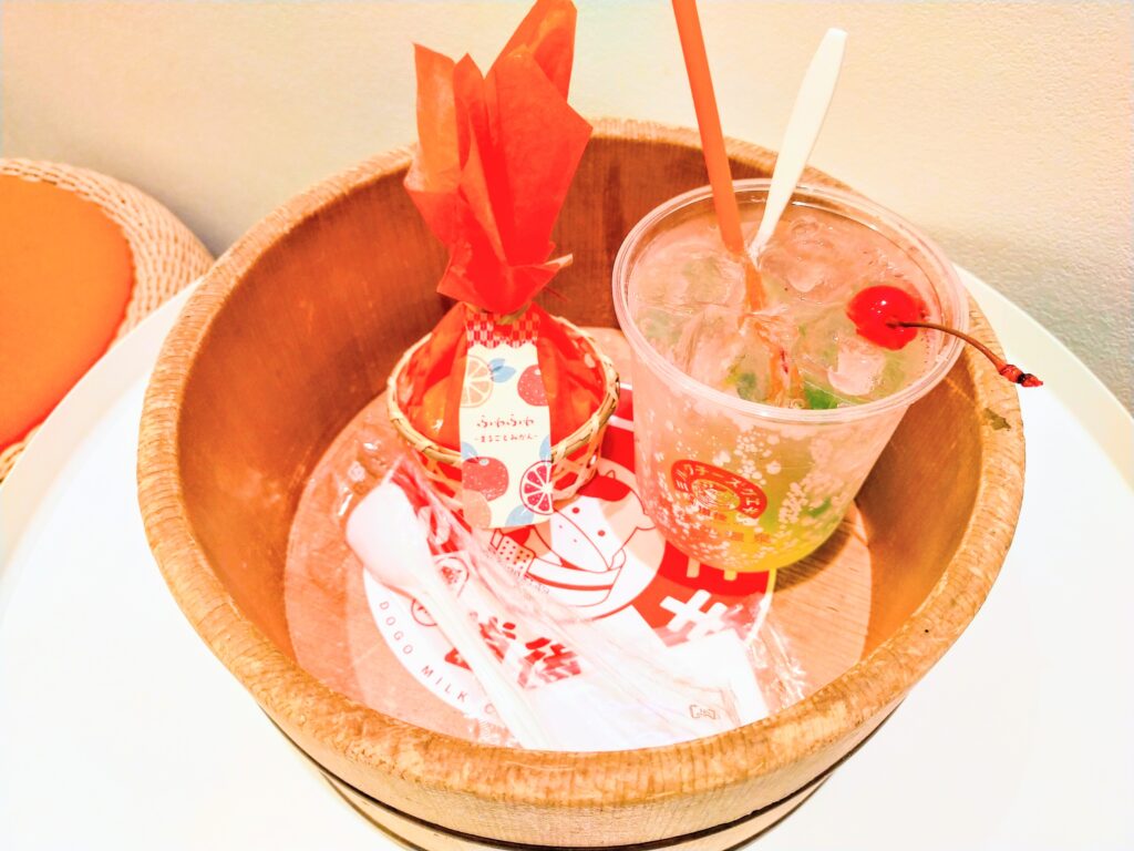 愛媛県産の完熟みかんを丸ごと1個包み込んだ「丸ごとみかんチーズケエキ」は、見た目のインパクトも抜群。中にはジューシーなみかんがゴロッと入り、ふわふわのチーズケーキと絶妙にマッチ。 使用されているチーズは、店内工房で毎日手作りされる自家製カッテージチーズを含む3種のブレンド。湯上がりの体に染み渡る、優しい甘さと爽やかな酸味が魅力です。