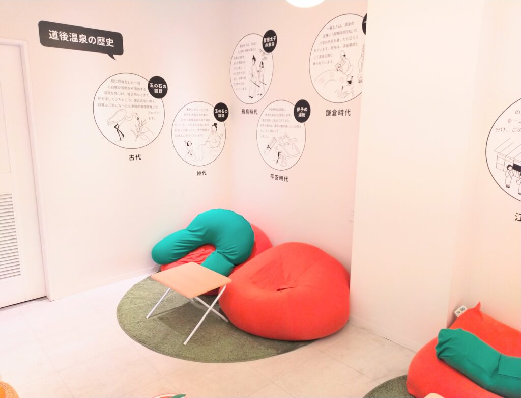 くつろぎスペースや、夏目漱石・正岡子規のイラストが描かれた壁面など、道後らしさも感じられます。