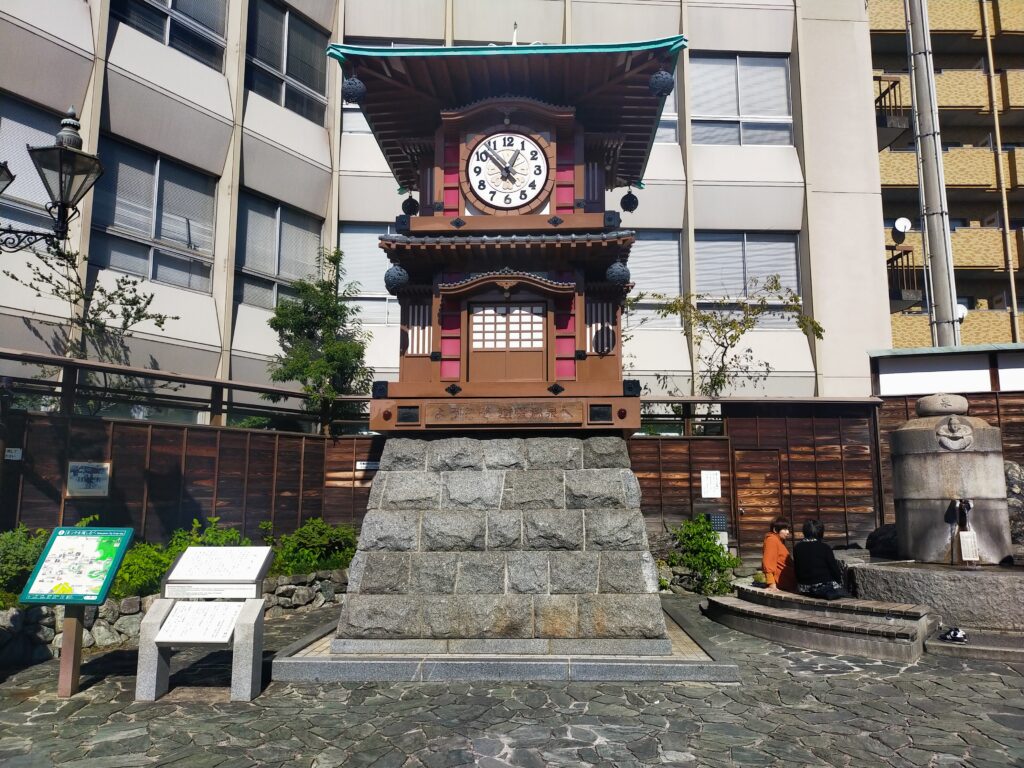 映画のワンシーンに出てきそうなおすすめスポット道後温泉駅前の放生園。ここには「坊っちゃんカラクリ時計」と「無料足湯」があります。