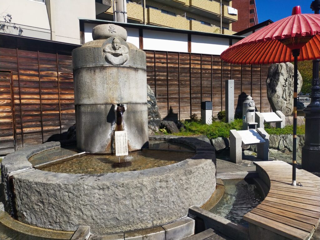 カラクリ時計の隣りには「無料足湯」。足湯に入るならタオル持参がおすすめ。