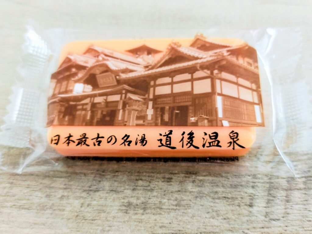 道後温泉本館の中で買える「みかん石鹸」。爽やかな柑橘の香りと、道後温泉のシンボル「湯玉(ゆだま)」が刻印されたレトロでかわいい石鹸。包装フィルムは少し渋い見た目ですが、袋を開けて取り出してみるとかわいい!?